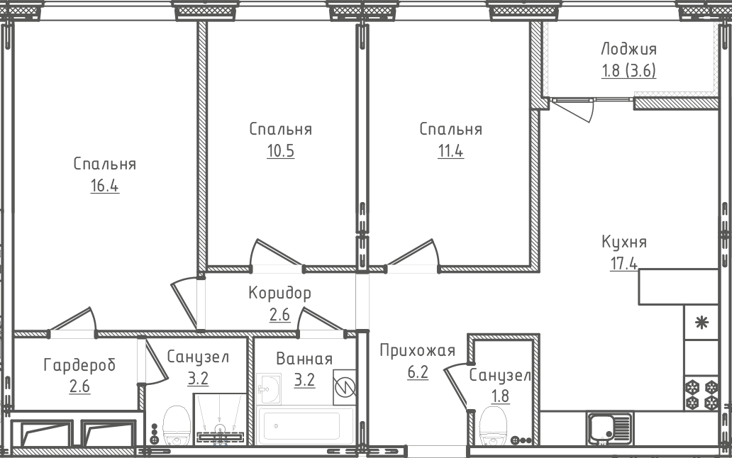 Трехкомнатная квартира №10 с видом двор. 2 этаж. Подъезд 1