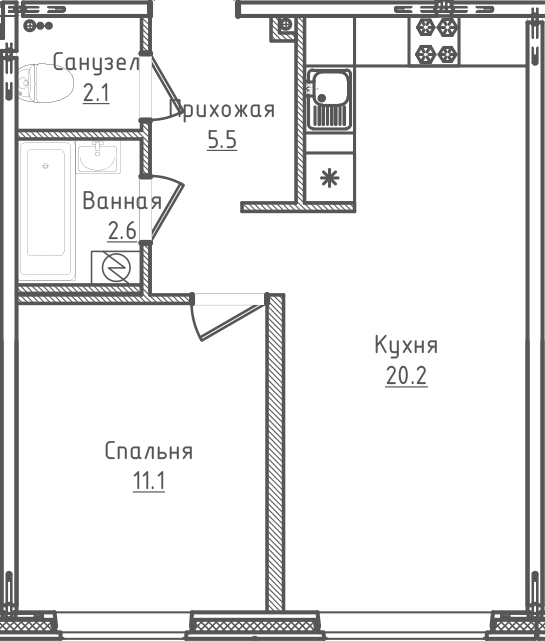 Однокомнатная квартира №83 с видом двор/улица. 2 этаж. Подъезд 2